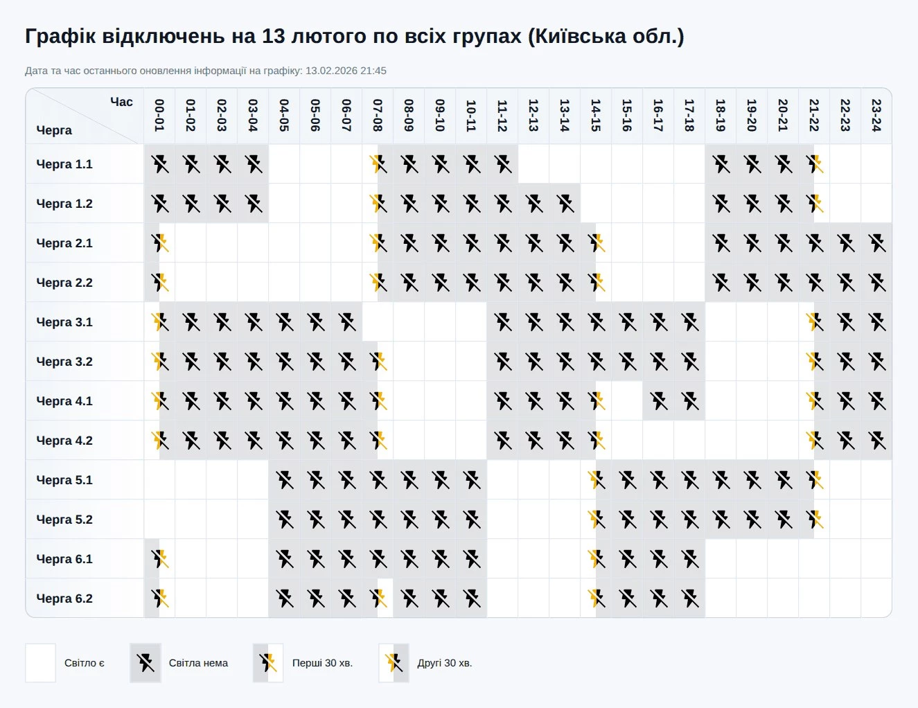 Графік відключення світла Київ на сьогодні - 13 лютого 2026